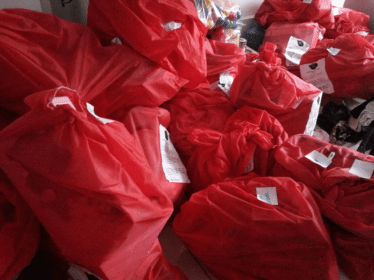 No mês de outubro, disponibilizamos grandes sacolas vermelhas nos condomínios que administramos. Estas sacolas servem para que as pessoas possam deixar ali suas doações.
